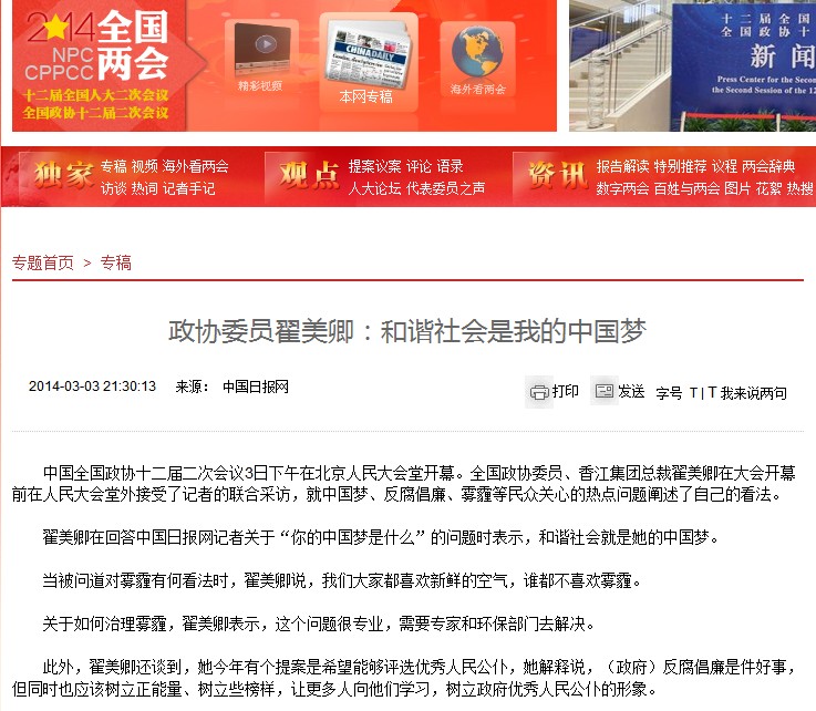 翟美卿在回答中國日報網(wǎng)記者關(guān)于“你的中國夢是什么”的問題時表示,和諧社會就是她的中國夢。